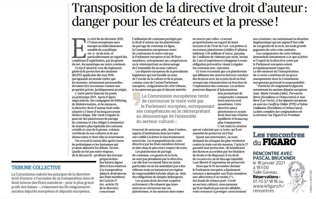 Accueil I Transposition de la directive droit d’auteur : danger pour les créateurs et la presse – Tribune dans le Figaro